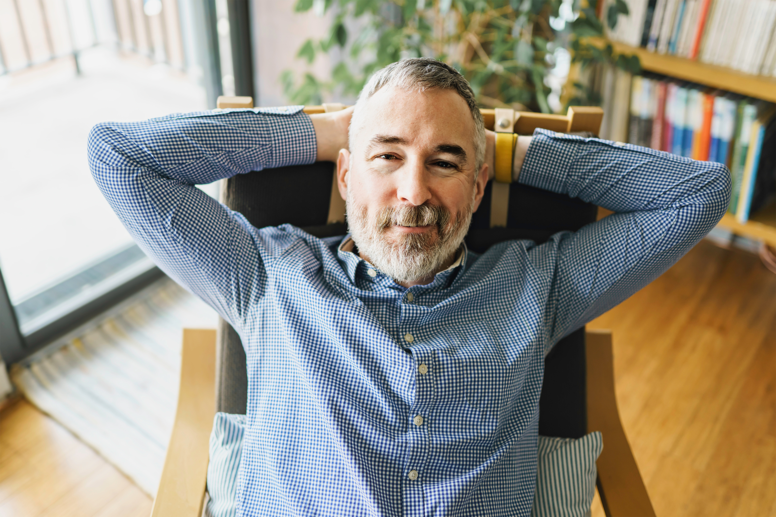 nice Joyful mature man at home appartement with grey beard relaxing on chair